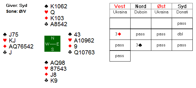 Duboin fortsatte med kløver til kongen og ny kløver, der vest stjal med spar 5. Ukraineren fridde seg med en ruter til kongen i nord, stjeling i øst og over stjeling med spar 8. Nord har nå telling på at øst sannsynligvis startet med 2515 fordeling og vest dermed 3271 og de siste to sparene. Han fortsatte derfor med spar til 10'eren i nord, der øst kunne hive en hjerter. Nå var posisjonen som følger: