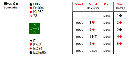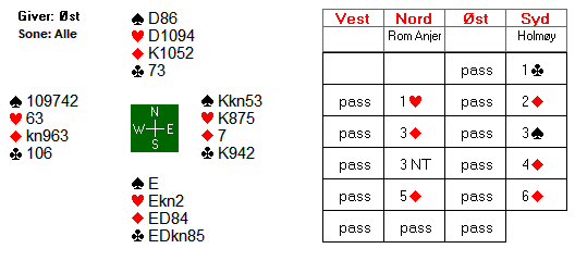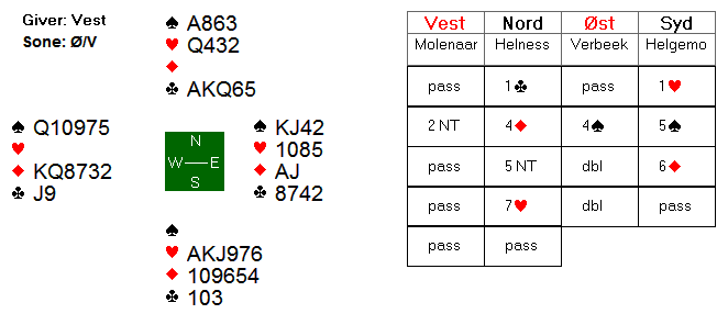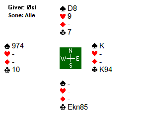 Øst spilte ut singel ruter til esset, etterfulgt av ruter til 10'eren i nord og stjeling i øst. Øst fortsatte med hjerter ess og hjerter til stjeling i nord.