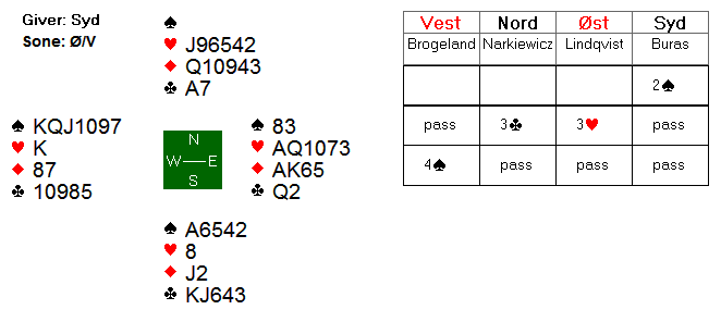 I lukket rom åpnet Lindkvist imed 2 kløver, Brogeland svarte 2 ruter og Øst gjenmeldte 3 kløver, fikk svar 3 ruter men på 3 NT inviterte Boye med 4 kløver og via kontroll 4 ruter ble 5 kløver løftet til lilleslem, 6 kløver. Her var hj AD beskyttet og 12 stikk bombesikert hjemme for +12 imp.