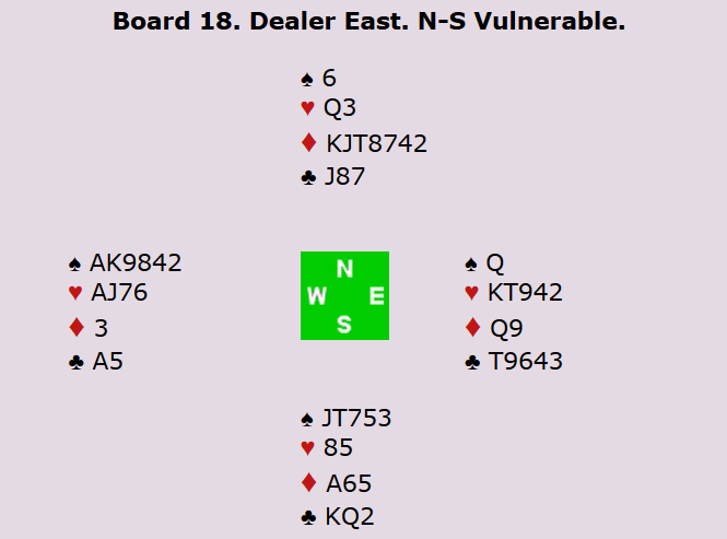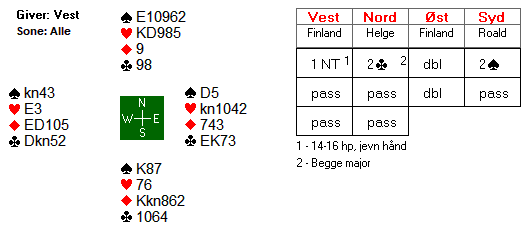 Her var Roald med til 4 spar, og fikk faktisk spille den kontrakten udoblet.To beit var billig moro da Tor Bakke spilte 3 grand med ni stikk ved det andre bordet. Dermed vant Norge 7 IMP på dette spillet. Det kan være flere oppsider med å melde 4 spar. Enten kan det stå, eller så kan det være en god stamp mot 4 hjerter.