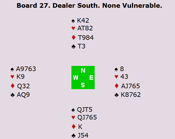 Vest kunne velge om han ville stjele over eller ei. Uansett ble det ikke mer enn to kløverstikk og ett stikk i hver av de andre stikkene for forsvaret. Dette spillet ga 13 IMP til Norge da Peter Marstrander og Tor Bakke spilte 3 kløver med ti stikk ved det andre bordet.