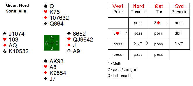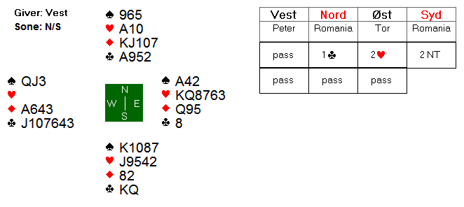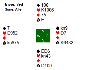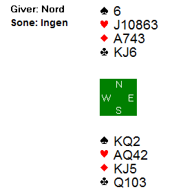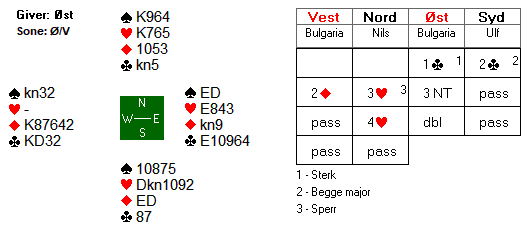 Nå måtte Ulf gjøre riktig i hjerter. Hvis ikke ville øst vinne med dama, fulgt av ny hjerter til esset og hjerter til stjeling for ei beit. Heldigvis stakk Ulf med kongen. Da ble det ti stikk siden ruteren ga de nødvendige avkastene. 620 på bok for Norge.