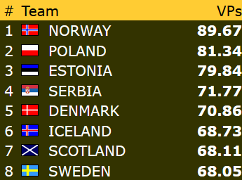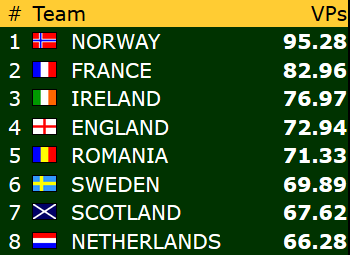 I 4 hjerter ble det ti stikk, og dermed13 IMP ut på det siste spillet. Kampen endte med 30-50-tap, og Norge fikk med seg 5 VP. Laget er nå nede på 9.plass.