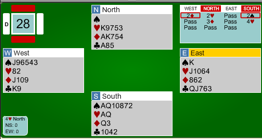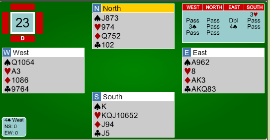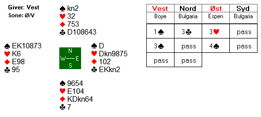 Denne gang ble det ikke riktig. Selv om det ble ei beit i kontrakten, fikk Bulgaria 8 IMP etter å ha meldt og vunnet 4 hjerter ved det andre bordet. I den kontrakten var det ikke mer enn to sparstikk og et trumfstikk å få tak i for forsvaret.