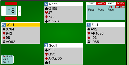 Med sine 21 honnørpoeng valgte han å passe syds ruteråpning, som ikke trengte å inneholde en eneste ruter. Soneforholdene var nok avgjørende for Boyes valg. Med mindre makker har en 5-korts majorfarge, er det 3 grand som er den eneste aktuelle utgangen. Om det står 3 grand kan det være at det er vel så lukrativt å spille motspill og hente sonebeiter i stedet.