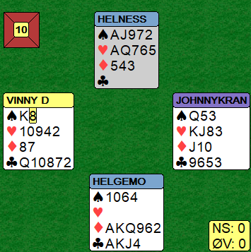Jeg spilte ut ruter knekt til esset, og spillefører fortsatte med 3 høye rutere, der han hev 2 hjertere og makker 1 hjerter.