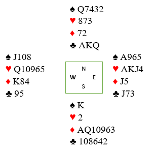 Det gikk altså ruter knekt, konge og esset fra nord. Nå ser du at spillefører ikke kan få mer enn det ene stikket.