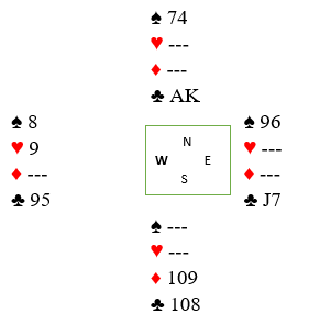 Det har altså gått to runder ruter, ruterstjeling hos øst, tre runder trumf etterfulgt av det spektakulære sparstikket. I andre sparrunde spar til tieren. Og da er altså sparen blokkert med åtteren singel, for hvis den stikkes over med nieren har nord stopper igjen. Men inne på vest sin hånd på spar 10 spilles de resterende trumfene. Før den siste ser det slik ut: