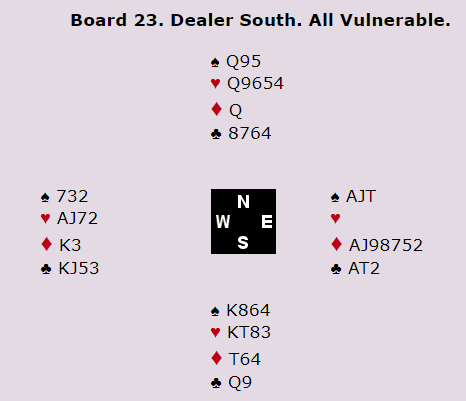Som man ser står det 7 ruter og 7 kløver imot så «stampen» i 6 spar som bare kostet 3 doblete beter, -800ble billig. Man hadde i de to foregående spillene sett at Ø-V, spesielt Ø var forsiktig, og det spørs hva som ville skjedd om Øst hadde våget 7 ruter. -800 ga solide +20 i score mens -1100 ville gitt -18 og 2170 for 7 ruter ville gitt -23 for lederne. Bare 3 av 27 par var i storeslem, man får jo ikke meldt i fred!