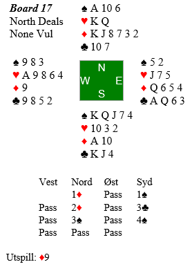 Resultatene viser at elleve stikk i 4 spar ga god score, omkring 75%. Det var dog noen som fikk tolv, kanskje etter ruter 9 i utspill hvor øst (feilaktig ) la i damen. Eller at de har fått god ruterfargen, og idet Ø/V kom inn så tok de ikke begge essene sine. Dessuten fikk noen få elleve stikk i grand.