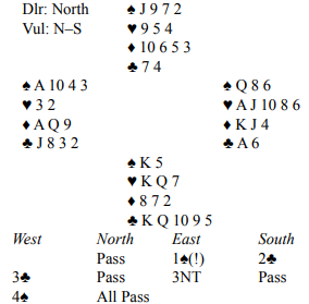 Ved det andre bordet kom øst i 3NT uten motmeldinger. Syd spilte ut kløver konge, og spillefører stakk og spilte mer kløver for å godspille seg et gyllent kløverstikk, og i håp om at den fargen satt 4-3. Men det ble litt feil da kløveren satt 5-2, og syd spilte god kløveren sin (to stikk) med nok en kløver til knekten.