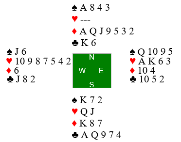 Ved ett bord var kontrakten 6 grand doblet spilt av syd, og da vest ikke fant hjerter ut ble det tretten stikk som i 6 grand doblet gir +1330. Men det var ikke nok til noen topp da de som var i 7 ruter jo fikk scoren 1440, og å sitte mot den uvanlige scoren 1330 ga kun bitte litt under middels selv om de altså kunne tatt seks hjerterstikk og fem doblede bet!