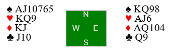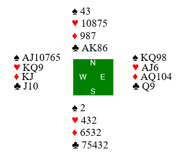 Legg merke til at i denne varianten har Ø/V samme samlede honnørstyrke som da spillet forekom. Men ser det slik ut som det her er slem nedlegg! Og da finnes slemmen ganske enkelt ved at vest over 4 ruter melder 4 hjerter som lover at han kan stoppe kløveren (!) - fargen øst hoppet over da han sa 4 ruter!