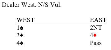 Makker på vests plass hørte 4 ruter, og om dere spiller med såkalt LAVESTE CUEBID så har du da benektet kløverkontroll. Det vet makkeren din! Siden han ikke har kontroll i den fargen slår han av med 4 spar. Han må ikke finne på å kontrollmelde hjerter i dette tilfellet. Hvis han hadde meldt 4 hjerter her ville han (logisk) lovet kontroll i kløver, fargen du benektet kontroll i. Hvis ikke han har det er meningsløst av han å fortsette kontrollmeldingene siden han jo vet vi har en åpen farge, så vi bør ikke melde slem uansett.