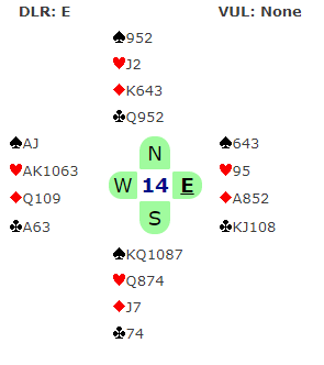 Kun noen få Ø/V par hadde funnet 3 grand. I den kontrakten ser det vanskelig ut med spar konge i utspill. Men om kløveren tippes og spilles for fire stikk vil syd få alvorlige problemer i de to siste kløverrundene. Altså kan 3 grand vinnes, men det må gjettes bra. Syd må holde tre hjerter og kan følgelig kaste en. Så må han i fjerde kløverrunde enten gi slipp på en spar eller en ruter. Hvis han kaster ruter kan ruter dame spilles fra vest, og det ruller opp den fargen, knekten faller! Og om syd kaster en spar har han ikke lenger nok motspillstikk til å bete 3 grand. Men spillefører må gjette. Syd kunne jo godt ha utstyrt seg med K-x i ruter i stedet, og dermed ha blanket ruter konge…