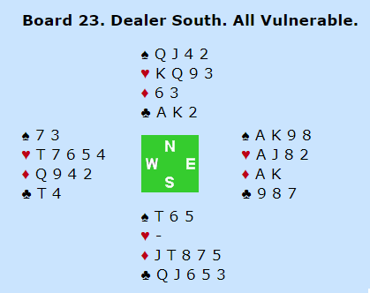 I den kontrakten er det kun to kløvertapere utenom trumfen som jo sitter nokså ubehagelig. Det er likevel ganske greit å få tak i ni stikk, men da Odin fikk timet det veldig bra fikk han "saget" opp nords trumfbeholding slik at det ble kun en trumftaper. Ett deilig doblet overstikk ble notert, +930. Det var sammen med resultatet ved det andre bordet verd 13 IMP for Norge!
