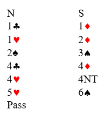 Fem par vant tretten stikk i 6 spar! Det var nok enten etter feil motspill, eller hjerter knekt i utspill som gir null hjertertaper ved å stikke med kongen og senere ta finesse over vests dame . Etter det utspillet blir det tretten om det trumfes to ruter (K-Q kommer på). De som fikk +1460 for tretten stikk ble belønnet med +151 av 155 oppnåelige poeng.