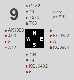 Idet nord var med og støttet makkeren sin til 4 ruter meldte Erik 6 kløver, en praktisk melding basert i hva han tror står! Over til Christer (vest) som ser ned på en fantastisk hånd i denne settingen. Kan virkelig makker melde 6 kløver uten å ha ruter ess og honnørene i sine farger. Christer satt jo selv med tre ess! Nei, makker må ha "resten" tenkte han og meldte det han trodde sto: 7 hjerter. Glimrende meldt!