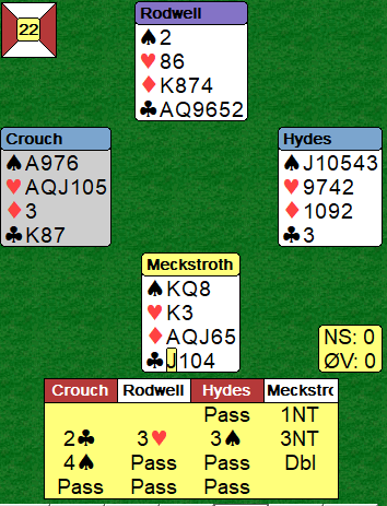 Nord kom inn. Sparen satt som ventet 4-3 fra start så nord kunne ikke ta mer enn to sparstikk i alt før han måtte spille kløver. Det betyr at nord fra start hadde fordelingen 4-3-1-5, noe som øker sjansen for at kløver dame er hos han sammen med fem kløver heller enn hos syd som hadde bare to kløver fra start. Idet kløveren kom fra nord la Lauria liten fra hånden, men da stakk syd med damen og kunne ta en bøtte med ruterstikk, to bet!