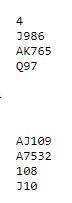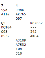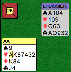 Dette er et litt skummelt spill da det står tretten stikk om man gjetter spar dames plassering. Det betyr ikke at storeslem bør meldes, men det er ikke helt håpløst å gjøre det når paret har knekten og tieren i spar. Normalt vil et samspilt makkerpar finne ut at trumf dame mangler, og da stoppes i 6 spar.