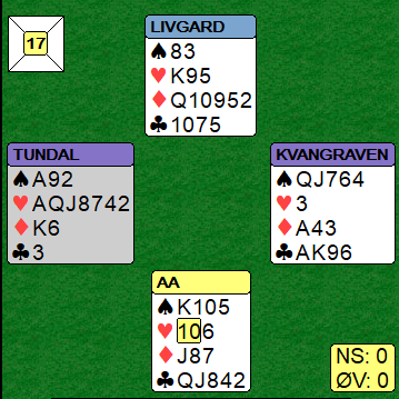 Så i denne runden fulgte jeg det tredje norske oppgjøret. Aa-Livgård hadde som nevnt klatret litt, men så fikk de en på trynet av sine lagkamerater da Tundal-Kvangraven meldte 6 spar med dette, en ganske så hardmeldt slem: