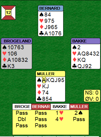 En god lilleslem i ruter ble meldt de fleste steder, også av Brogeland-Bakke. Det så ut til at runden mellom de to norske parene skulle ende omtrent uavgjort, men så fikk Bakke inn et kanonspill.