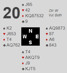 Vest hadde nesten perfekte kort til øst. Med kløver knekt i stedet for hjerter knekt ville utgangen "kun" vært avhengig av 3-2 i trumf og kløverfinesse. Slik det var er 4 spar et tvilsomt prosjekt, og det ser ut som om det er nødt til å bli to hjertertapere, en rutertaper og en kløvertaper selv om kløverfinessen går. Men slik det sitter må det godt motspill til for å bete 4 spar. Jeg tror syd det må et helt usannsylig utspill til, liten kløver! Om syd etter å ha tatt to hjerterstikk som er naturlig skifter til liten kløver vinnes ved å legge liten kløver fra vest! Nord vinner for nieren, men så, etter ruter tilbake fra han vinnes med esset fulgta av seks ganger spar som skviser syd sønder og sammen. Og mer naturlig er vel to store hjertere fulgt av ruterskift. Da vinnes om spillefører timer det riktig. Han kan lajsere ruteren for å justere tempoet for skvisen som kommer mot slutten, eller han kan vinne med ruteress og ta ut trumfen fulgt av at han gir dem ett stikk i ruter. Samme hva de fortsetter med vil syd bli skviset senere. La oss si nord fortsetter med ruter etter den starten, og spillefører trumfer. Så resten av trumfene, og før den siste ser det slik ut: