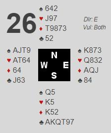 Han hørte pass fra syd (syd giver, alle i sonen) og åpnet med 1 spar. Nord meldte inn 2 hjerter, og fra makkeren (øst) fikk han 2 grand som lovte firekorts sparstøtte og minst kort gode nok til utgangsinvitt. Syd sa 4 hjerter, og vest sa 5 kløver, kontrollmelding. Øst slo av i 5 spar. Ville du likevel meldt slem? Siden makkeren ikke kunne kontrollmelde 5 ruter er det fare for en taper der, og trumfen er jo veldig tynn, selv om den er lang. Inderen løftet imidlertid modig til 6 spar. Og det viste seg at øst hadde ruterkontroll, men det var et annet problem - trumfen. Slik så hele spillet ut: