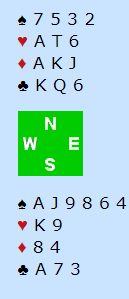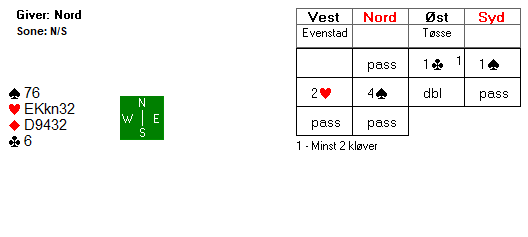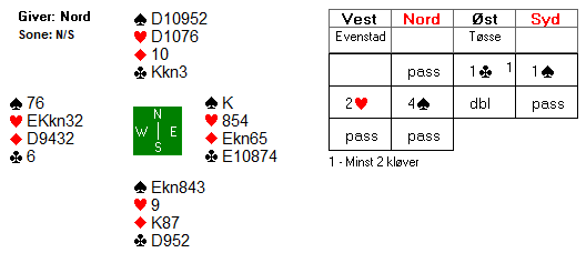 Merk at det er en safevariant i trumf her, hvis trumfen sitter litt annerledes i mot. Det bør spilles liten til knekten hvis øst følger med spar 10 i første runde. Her kommer kongen på og det er ingen problemer, men hvis øst hadde fulgt på med tieren er riktig spill å legge knekten. Om vest kan stikke den sitter fargen 2-1, ingen problemer, og ekstrasjansen spillefører får med seg er at øst har K-Q-10, altså alle trumfene på den siden. Har han det hjelper det ikke motspilleren å legge i en stor trumf i fargens første, tvert om, det hjelper spillefører som kanskje kan overse safevarianten om øst følger med tieren. Sånn som det satt var det ingen problemer i spillet, tolv enkle stikk, men det var problemer i meldingene.