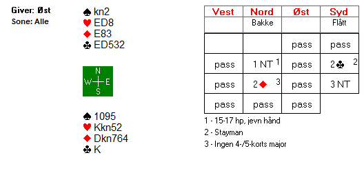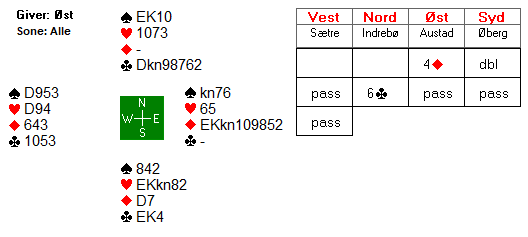 Dette er selvsagt ikke enkelt å vite i meldingene. Og om øst hadde hatt «feil» fordeling i majorfargene (fire spar og to hjerter) ville det ikke vært mulig å vinne tretten stikk.