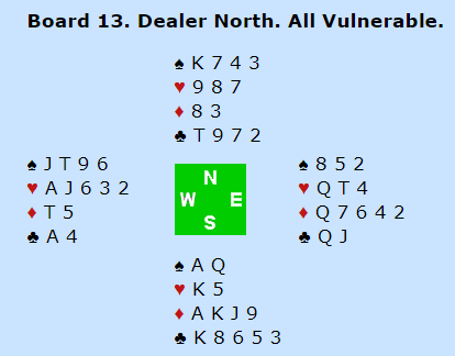Å gå bet i 2NT var ganske standard. Hvilket kort øst spilte tilbake betød ingen ting siden vest hadde A-J i toppen av utspillsfargen. Merk dog at det ikke koster noe at øst spiller den lille hjerteren i fargens andre runde, det kan ikke bli noen blokkering i denne situasjonen. Thea Lucia Indrebø for det norske U-26W laget spilte liten hjerter tilbake, men dessverre så ga det ikke noe ekstra denne gangen.