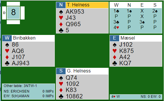 Her synes jeg vinnerlagets Åse Biribakken-Helge Mæsel meldte godt og logisk i kampen mot lag Erichsen (Helen og Espen Erichsen sammen med Tor og Gunn Helness) som ble nr. 4 til slutt, like bak bronseplassen:
