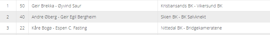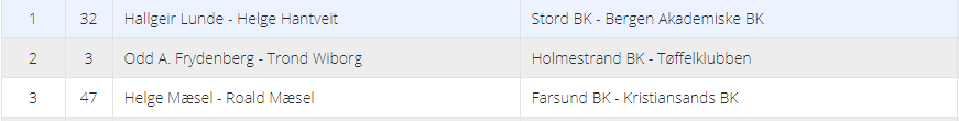 Seieren gikk til lag PATTON med Tor Eivind Grude – Christian Bakke og Øyvind Saur-Lars Arthur Johansen. De vant med kun 1 VP margin foran laget som kalte seg Helt Nils og bestod av Aleksander Flakstad-Jacob Duschek og Nils Kåre Kvangraven-Kenneth Syversen. På 3.plass kom lag Hel med Espen Haugstad-Lisbeth Glærum og Ann-Mari Mirkovic Juvik-Bjørn Inge Hanssen på laget.