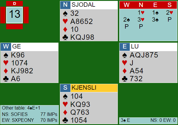 Ved det andre bordet gikk som du ser den kinesiske øst innpå med 1 spar. Syd sa 2 hjerter og vest 2 spar. Sofie (nord ) meldte 3 hjerter, og da sa øst 3 spar som ble sluttkontrakten med elleve stikk, Kina + 200 og 10 IMP til det norske laget som dermed tok en litt større ledelse før de siste fjorten spillene, 17 IMP.