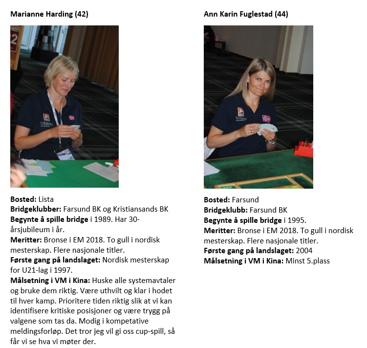 Knut prtøvde seg med ru 8, men Syd hadde ru 10 som vant og spilte ru K opp igjen og Molander fikk for esset. Det fulgte kløver mot bordet, Syd la i damen og kongen vant. Nå valgte Øst å satse på at Syd ikke hadde flere kløvere, han spilte ny ruter der Syd fikk for damen sin. Og nå sto resten! Hvorfor kan du lure på. Jo Syd hadde 5-1-5-2 i fordeling og var jo innspilt og måtte spille enten ruter eller spar til dobbeltrenons. +420 til Ø-V ga dem +122 imp. Bare tre par vant 4 hjerter, men mange var i 5 hjerter som alltid betes. Trolig fordi Syd har vist tofargehånd med 5 kort spar (Michael cue). 4 spar av Syd/Nord er bare en bet, god stamp altså og presser det Ø-V til 5-
