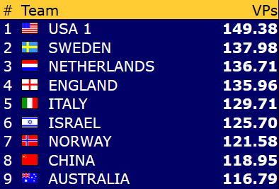 Vi ønsker damene lykke til videre i mesterskapet! Allerede i neste kamp kan deres jakt på flere IMP og vinnerpoeng følges direkte på BBO. Motstander er USA 2, og Norge stiller med Marianne - Ann Karin og Bodil - Liv Marit.