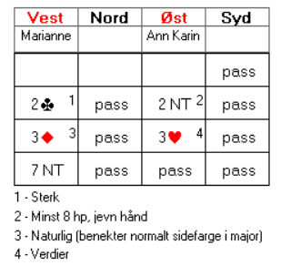 Vest har nok ikke begge essene fordi hun da ville åpnet på 1-trinnet siden hun allerede er markert med dame-knekt i hjerter.