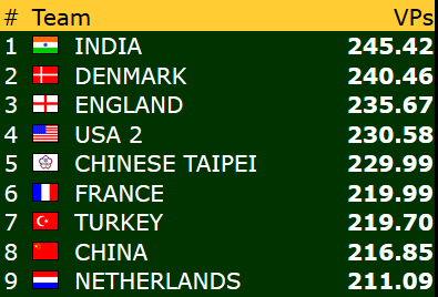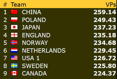 I åpen klasse og dameklassen har Norge fått en flott start på VM i Wuhan. Begge lagene har to storseiere og ett klart tap. Også veteranene har to seire og ett tap, men den samlede VP-sankinga har vært lavere enn for de to andre lagene. Uansett henger alle våre lag godt med i kampen om avansement til sluttspillet etter tre av 24 kamper. Vi er så vidt i gang, men det er aldri en ulempe å få god start. Under følger resultatene fra første dag og stillinga så langt (klikk på overskriftene for komlette resultatlister).