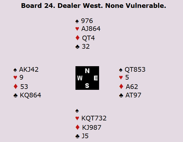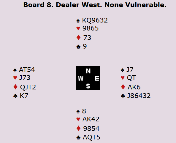 Den israleske spilleren spiltye i stedet spar til finesse. Han håpte nok på 4-2 med Dx eller Kx i Nord. Det vil bare gi en taper i trumf, men her holt ikke den planen og det endte med 1 bet. 12 imp til Norge.