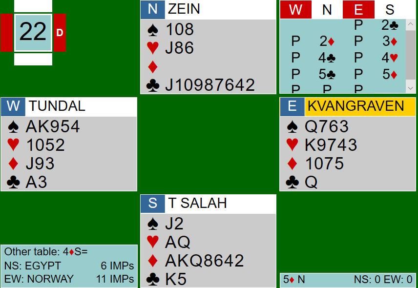 Mot Terje Aa (V)- Allan Livgård (Ø) meldte svenskene Rimstedt (O. i N og M. i S) slik: 1 NT fra Syd, 2 kløversøk (Stayman) fra Nord og svar 2 hjerter fra Syd. 3 kløver fra Nord var trolig gjentatt søk og svaret 3 NT lovte dermed 2-4 i major. Da Nord så meldte 4 ruter var det klar sleminvitt og Syd cue- bidet 4 hjerter (1./2. kontroll) før Nord brukte 5 ess Blackwood og da svaret 5 kløver kom kunne Nord avslutte med 6 grand. Det er den beste kontrakten som alltid vinnes. Hva skjedde så ved det andre bordet der Boye Brogeland (Syd)- Espen Lingqvist (Nord) møtte svenskene Nystrøm (V)- Upmark (Ø)? Jo det startet med 1 NT fra Syd og svar 3 kløver (alertert) fra Nord som var en spesialkonvensjon og 3 ruter fra Syd. Før 3 NT og 4 ruter fartsatte trumfen. Etter 5-ess BW- søk ble bare 4 ess avdekket og kontrakten derfor lagt i 6 ruter. Bra det også- men ikke i dette tilfellet. Hvorfor? Jo hj 9 kom ut til Øst sitt ess og så ny hjerter som Vest kunne stjele. Hjerterfargen satt virkelig 5-1 imot og en sonebet mot 1440 ut ved det andre bordet kostet nordmennene 17 imp. Sverige vant kampen 87-21.