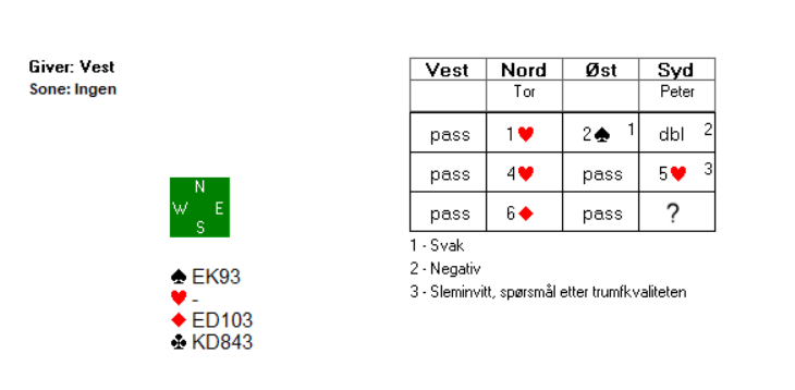 Peter var nok litt usikker på betydninga av 6 ruter, men det bør kanskje bety at makker har en solid hjerterfarge og tar med seg å vise sidefarge i ruter på vei til 6 hjerter. I så fall vil vet be makker om å velge mellom 6 ruter og 6 hjerter. I kampen mellom Norge og Sverige i åpen klasse endte begge bordene i 6 ruter, om enn på litt forskjellige vis. Peter på sin side valgte å melde 6 grand. Da han fikk se bordet ønsket han nok heller å være i minorslemmen: