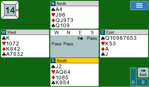 La oss si meldingene går omtrent slik: 1 hjerter fra syd, 1 spar fra vest, 3 hjerter fra nord, 3 spar fra øst, og vest avslutter meldingene med 4 spar over syds 4 hjerter. Ett sted gikk meldingene 1 hjerter (syd), dobler fra vest, 3 hjerter fra nord, dobler fra øst (!), 4 hjerter fra syd og 4 spar fra vest med pass rundt.