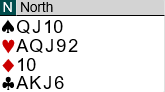 Jeg tror det riktige er å fastslå at makkers litt uventede utspill er en singelton omtrent hundre av hundre ganger. Hvorfor vil han ellers blindt spille ut en umeldt farge etter at egen side har meldt og støttet hjerter? Det var overaskende å se at mange på syd sin plass forsøkte en stor hjerter da de var inne på trumfesset. Da føk kontrakten hjem i full fart siden hele spillet så slik ut: