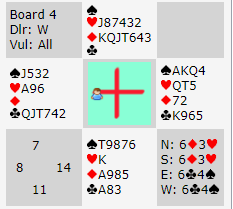 Ett Ø/V-par doblet alt for tidlig og N/S fikk spille 3 ruter doblet med tolv stikk, +1270. Deretter var det en rekke på fem par som hadde +950, en haug med +620 i 5 ruter, og kun ett par spilte kløverkontrakt Ø/V. Merk at det står nedlegg i 6 kløver den andre veien!