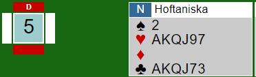Lederparet på butleren i 2.divisjon, Hoftaniska-Charlsen meldte altså slik og kom i 7 hjerter. Andre sa 7 grand, men i lagkamp gir jo ikke forskjellen på 2220 og 2210 noe utslag. Et argument mot 7 hjerter er dog at det kan jo hende det kommer utspill til stjeling i sidefargen kløver, men å si 7 hjerter er ok. I parturnering eller Board-A-Match er jeg imidlertid sikker på at Hoftaniska ville sagt 7 grand.