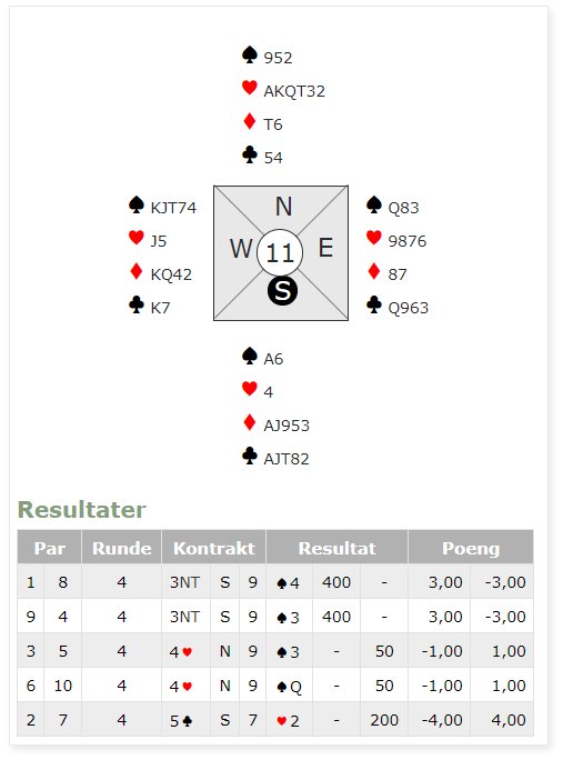 Dessverre gikk Øst ved det andre bordet inn med 1 spar over ruter åpningen , Syd passet og Vest meldte 1 grand. Som Syd så doblet etter pass fra Nord og Øst. Mer enn 5 stikk var det ikke mulig å få, men likevel endte spillet opp med 11 imp gevinst for Aaseng- laget.