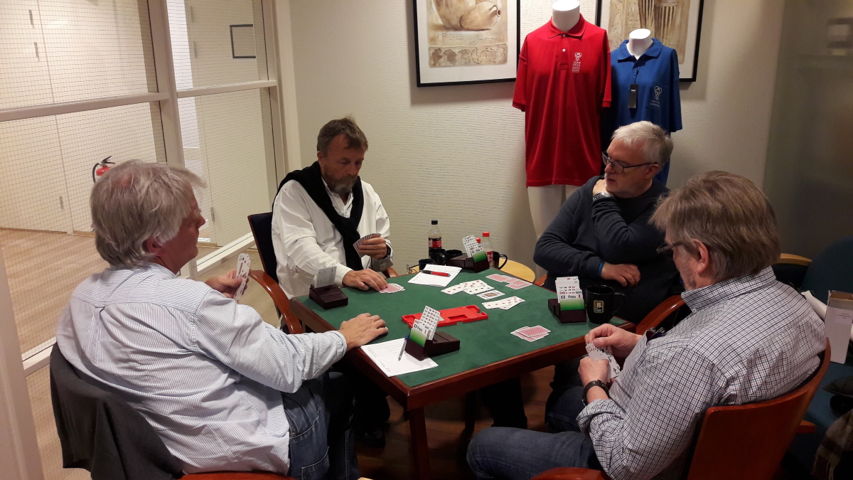 Etter første dag av kvalifiseringa til neste års EM for veteranlag leder lag Johnsen (Sverre Johnsen, Åsmund Stokkeland, Jan Mikkelsen og Arve Farstad) med IMP-sifrene 91-73 over lag Anderssen (Rune B. Anderssen, Peter Marstrander, Lars Eide og Alf E. Anderssen). Dermed er det hele nokså åpent før de 32 siste spillene i morgen. De to siste settene spilles henholdsvis klokka 10 og 12 søndag. Som tidligere lovet skal vi ta et tilbakeblikk på et par av spillene fra dagens siste sett.