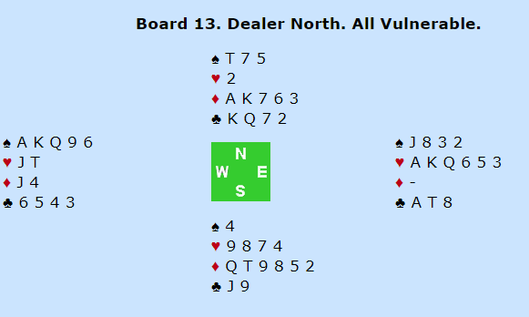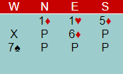 Der Klukowski satt vest og Gawrys øst startet meldingene med 1 ruter fra nord og 1 hjerter innmelding fra Gawrys (øst). Da spratt syd i 5 ruter! Det er sannelig ikke lett å finne ut hva som er riktig når man ikke får kommunisert noe før på femtrinnet. Men polakkene fant ut av det. Vest doblet, og øst meldte 6 ruter, og da tok vest sjansen på storeslem. Her ser du hele meldingsforløpet: