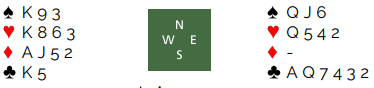 Siden nord har fulgt med nieren og trumfet med tieren er det en mulig finesse hos vest med K-8, hvis syd har igjen J-x og nord er fri for trumf. Hvis det er riktig å ta den finessen satt syd med tre hjerter, A-J-x, og nord 10-9 dobbel fra start.