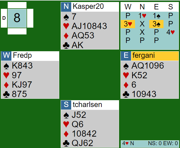 Tilbake til hvordan hjerteren trolig ser ut her. Makker la altså åtteren, ikke akkurat et lite kort. Vel, det er ikke slik at det er størrelsen på kortet som spiller rolle, men rekkefølgen man legger kortene i er avgjørende. Lav-høy betyr «fortsett», uavhengig av hvor store kort det er!
